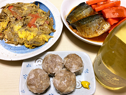 本日のメニューは、上段左からきんぴらごぼうの玉子炒め、サバ味噌煮と茹でにんじん、下段がシュウマイ(既成品)、です。
