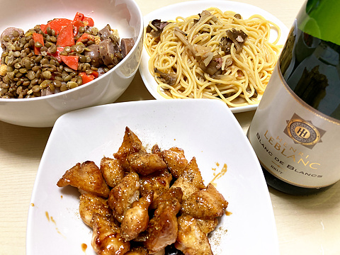 本日のメニューは、上段左からソーセージとレンズ豆の温サラダ、きのこの和風パスタ、下段がボンジリの焼き鳥、です。