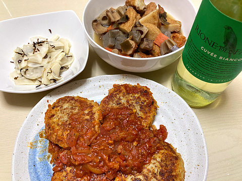 大豆入りハンバーグのトマトソースがけ、他