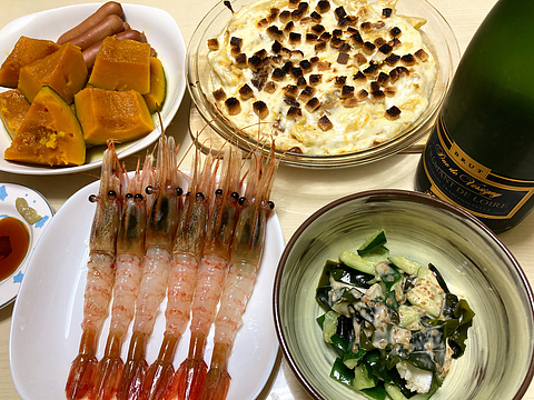 カボチャとウインナーのコンソメ煮、他 本日のメニューは、上段左からカボチャとウインナーのコンソメ煮、残りものグラタン、下段左からボタン海老の刺身、イカときゅうりとワカメの胡麻サラダ、です。 グラタンのクルトンがちょっと焦げてしまいました。でも味はおいしかったです。