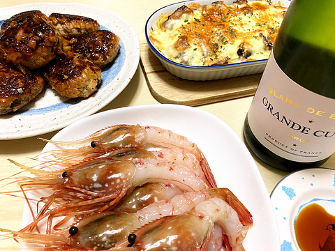 本日のメニューは、上段左から根菜入り合挽きつくね、オイルサーディンのチーズ焼き、下段がボタン海老の刺身、です。