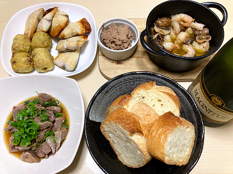 本日のメニューは、上段左から塩サバとチーズ入りちくわ天(既製品)、レバーパテ、海老とマッシュルームのアヒージョ、下段左から砂肝のわさびポン酢和え、パン、です。