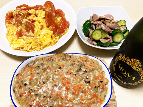 本日のメニューは、上段左からトマトの玉子炒め、砂肝ときゅうりのキムチポン酢和え、下段がシーフードドリア、です。
