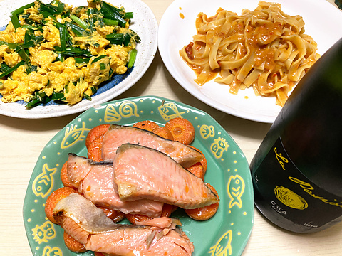 本日のメニューは、上段左からニラ玉、カニのトマトクリームパスタ、下段が鮭の塩麹漬け焼き、です。