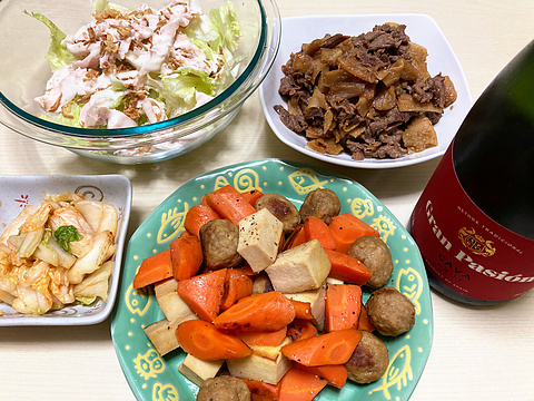本日のメニューは、上段左から鶏ハムとレタスのシーザーサラダ風、牛肉とかんぴょうの時雨煮、下段左から白菜のキムチ漬け、肉団子と高野豆腐とにんじんのバター醤油炒め、です。