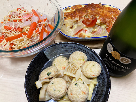 本日のメニューは、上段左から大根とにんじんのツナパスタサラダ、白菜のクリーム煮ドリア、下段ががんもどきとタケノコの煮物、です。