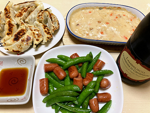 本日のメニューは、上段左から焼き餃子、チキンドリア、下段がソーセージとスナップエンドウの塩炒め、です。