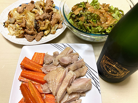 本日のメニューは、上段左からホイコーロー、サニーレタスのザーサイ和え、下段が鶏もも肉の塩麹漬け焼き、です。