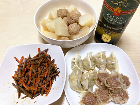 本日のメニューは、上段が肉団子と大根の洋風煮、下段左からきんぴらごぼう、自家製シュウマイと自家製餃子、です。