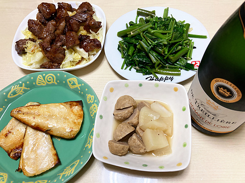 本日のメニューは、上段左からみかも牛ソテー、空芯菜の青菜炒め、下段左から焼き塩サバ、肉団子と大根のコンソメ煮、です。
