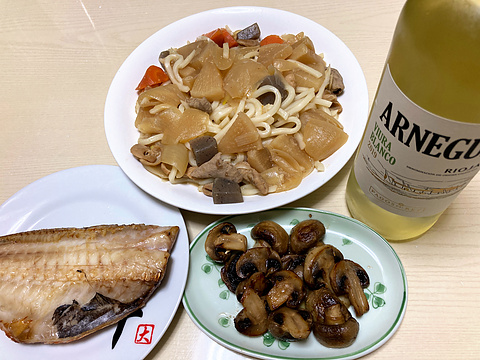 本日のメニューは、上段がもつ煮込み焼きうどん、下段左から赤魚の干物、マッシュルームのバターソテー、です。