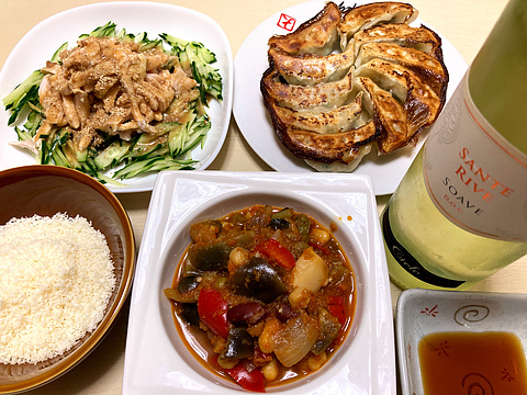 本日のメニューは、上段左から自家製サラダチキンのバンバンジー、焼き餃子(市販品を焼いたもの)、下段がラタトゥユ&パルミジャーノレッジャーノのすりおろし、です。