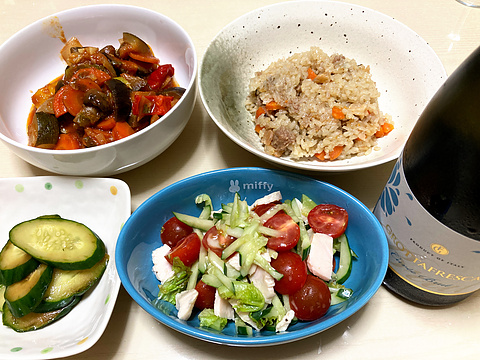 本日のメニューは、上段左からラタトゥイユ、シュウマイの中華おこわ、下段左からきゅうりの黒酢しょう油漬け、サラダチキンとトマトのサラダ、です。