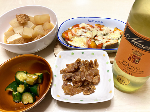 本日のメニューは、上段左から生揚げと大根の煮物、カボチャのチーズ焼き、下段左からきゅうりのキムチ漬け、鶏皮せんべい、です。