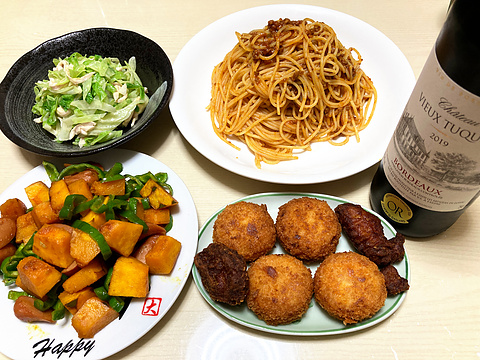 本日のメニューは、上段左から自家製サラダチキンとキャベツのサラダ、ボロネーゼパスタ、下段左からジャーマンかぼちゃ、クリームコロッケと鶏のから揚げ(市販冷凍品)、です。