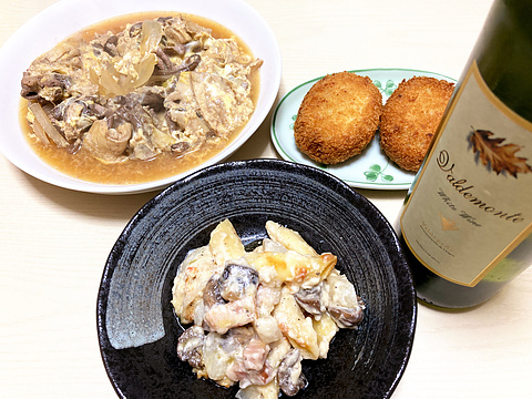 本日のメニューは、上段左から牛肉と湯葉の玉子とじ、コロッケ(市販冷凍品)、下段がかぶのグラタン、です。
