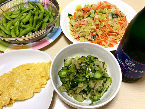 本日のメニューは、上段左から枝豆、焼きビーフン、下段左からプレーンオムレツ、きゅうりとセロリの海苔サラダ、です。