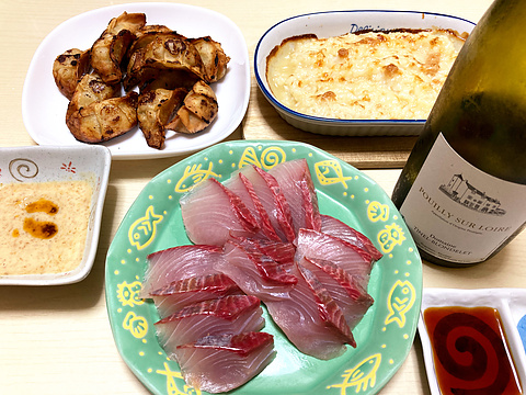 本日のメニューは、上段左から揚げ餃子、海老ドリア、下段がヒラマサの刺身、です。