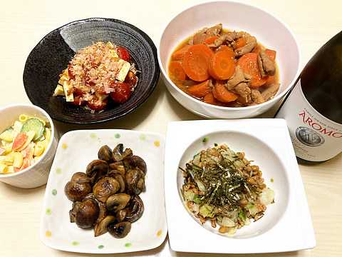 本日のメニューは、上段左からトマトとチーズのおかか和え、もつ煮込み、下段左からマカロニサラダ、マッシュルームのバターカレーソテー、白菜漬けの納豆和え、です。