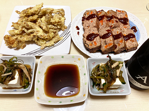 本日のメニューは、上段左からヒラタケの天ぷら、鶏レバー入りミートローフ、下段がやっこの出汁がけ、です。