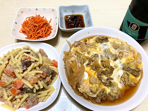 本日のメニューは、上段左からにんじんのラペ、うなぎの肝の山椒佃煮、下段左からミートローフ入りクリームパスタ、ヒラタケの天ぷらとかんぴょうの玉子とじ、です。