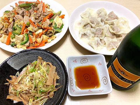 本日のメニューは、上段左からゴーヤチャンプル、自家製茹でワンタン、下段がめんまとネギとみょうがの和え物、です。