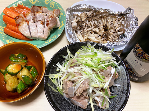 本日のメニューは、上段左から豚肉の塩麹漬け焼き、しめじのホイル焼き、下段左からきゅうりのキムチ漬け、豚軟骨のブイヨン煮込み、です。