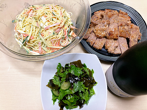 本日のメニューは、上段左からサラスパサラダ、豚肉の酒粕みそ漬け焼き、下段がきゅうりとワカメとセロリの酢の物、です。