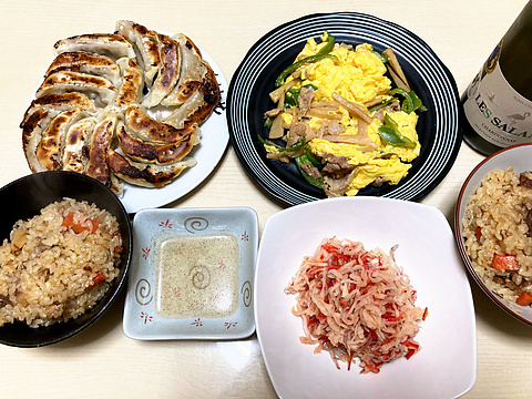 本日のメニューは、上段左から焼き餃子(冷凍品を焼いたもの)、チンジャオロースー玉子炒め、下段左から牛すじ煮込みのおこわ、切り干し大根と干しエビとちりめんじゃこの酢の物、です。