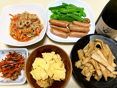 本日のメニューは、上段左から切り干し大根の煮物、ソーセージと絹さや、下段左からいかにんじん、厚焼き玉子の切り落とし、自家製めんま、です。