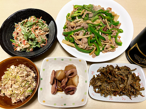 本日のメニューは、上段左からセロリの葉と切り干し大根の煮物のサラダ、チンジャオロースー、下段左から酒粕味噌漬け肉のなめろう風、イカと里芋の煮物、きんぴらごぼうのかき揚げ風、です。