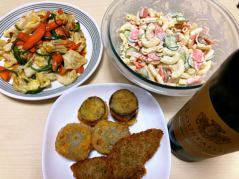 本日のメニューは、上段左からキャベツのペペロンチーノソース炒め、マカロニサラダ、下段が揚げ物各種(市販品を揚げたもの)、です。