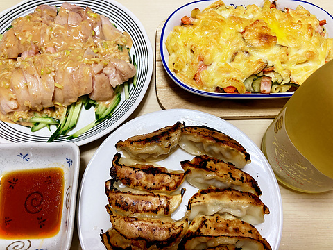 本日のメニューは、上段左から低温調理鶏のバンバンジー、マカロニサラダのグラタン、下段が焼き餃子あ(市販品を焼いた物)、です。