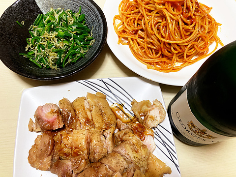 本日のメニューは、上段左からピーマンのちりめんじゃこ炒め、トマトソースパスタ、下段が自家製低温調理鶏の照り焼き、です。