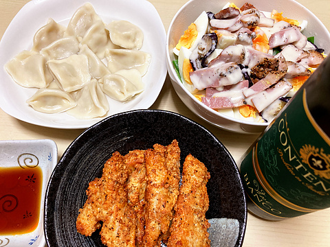 本日のメニューは、上段左から水餃子(市販品)、じゃがいもとモロッコインゲンのニース風サラダ、下段がチキンバー(冷凍品を揚げたもの)、です。