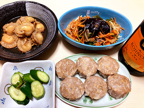 本日のメニューは、上段左からホタテの時雨煮、ナスの南蛮漬け、下段左からきゅうりの浅漬け、シュウマイ(市販品)、です。