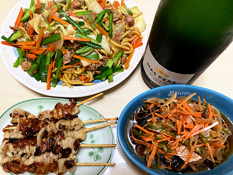本日のメニューは、上段がソース焼きそば、下段左から鶏皮の焼き鳥、ナスの南蛮漬け、です。