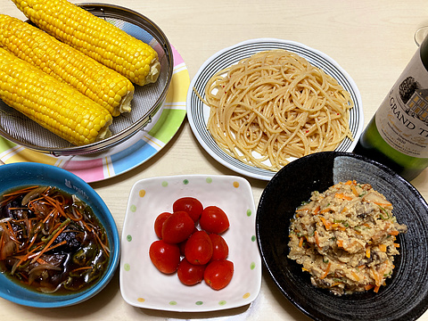 本日のメニューは、上段左からとうもろこし、ペペロンチーノパスタ、下段左からナスの南蛮漬け、トマトの浅漬け、卯の花、です。