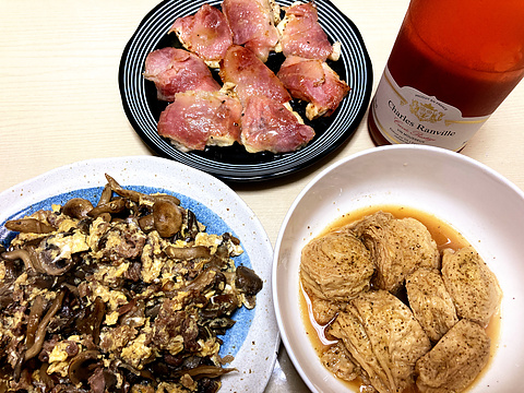 本日のメニューは、上段が鶏胸肉のサルティンボッカ風、下段左から牛肉としめじの玉子炒め、揚げ巻き湯葉の煮物、です。