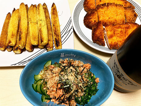 本日のメニューは、上段左からヤングコーンのバターしょう油焼き、チーズささみフライ(冷凍品を揚げたもの)、下段がモロヘイヤときゅうりの鮭フレーク和え、です。