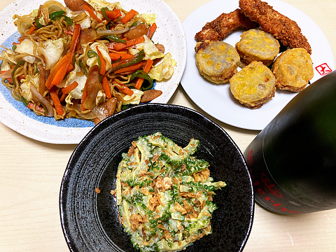 本日のメニューは、上段左からソース焼きそば、レンコンの挟み揚げとチキンバー(冷凍品を揚げたもの)、下段がゴーヤのみそマヨ和え、です。