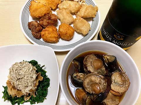 本日のメニューは、上段がから揚げ各種(冷凍品を焼いたもの)、下段左から空芯菜の葉のザーサイとろろ昆布和え、ホタテとナスの焼き浸し、です。