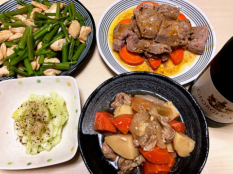 本日のメニューは、上段左から鶏胸肉の空芯菜炒め、豚肉のペペロンチーノ、下段左からウリの浅漬け、肉じゃが、です。
