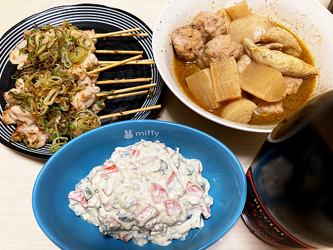 タコボールと鶏皮餃子と大根のカレー煮、他