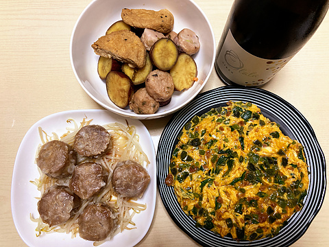本日のメニューは、上段がさつまいもと練り物の煮物、下段左からシュウマイ(市販品)、つる菜と鶏そぼろのオープンオムレツ、です。