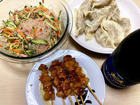 本日のメニューは、上段左から春雨サラダ、自家製水餃子、下段がぼんじりの焼き鳥(市販品を焼いたもの)、です。