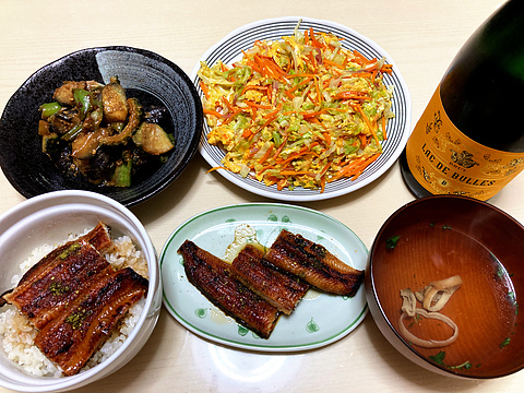 本日のメニューは、上段左から鍋しぎ、キャベツと生ハムの玉子炒め、下段がうなぎと肝吸い、です。