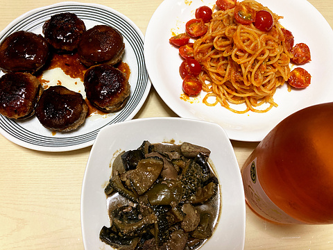 本日のメニューは、上段左から椎茸の肉詰めのニンニクぽん酢焼き、自家製トマトソースパスタ、下段が鶏レバー入り鍋しぎ、です。