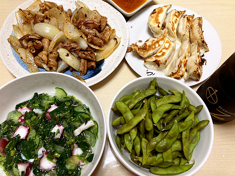 本日のメニューは、上段左からもつの塩麹漬けの玉ねぎ炒め、焼き餃子(市販品を焼いたもの)、下段左からタコとモロヘイヤときゅうりの酢の物、枝豆、です。