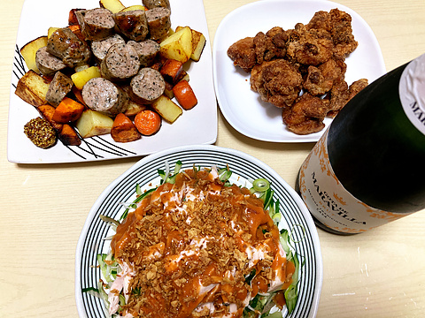 本日のメニューは、上段左からジャーマンポテト、鶏のから揚げ、下段が自家製サラダチキンのバンバンジー、です。